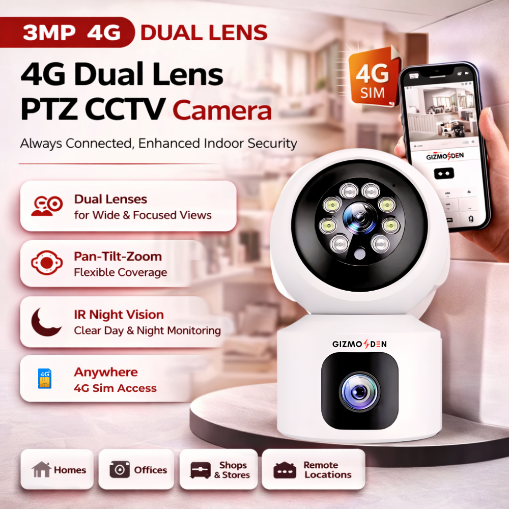 The 3MP 4G Dual Lens Indoor PTZ CCTV Camera is designed for flexible indoor security with enhanced coverage and remote accessibility. Featuring a dual-lens system, it delivers both wide-angle and focused views, ensuring complete monitoring of your space.
